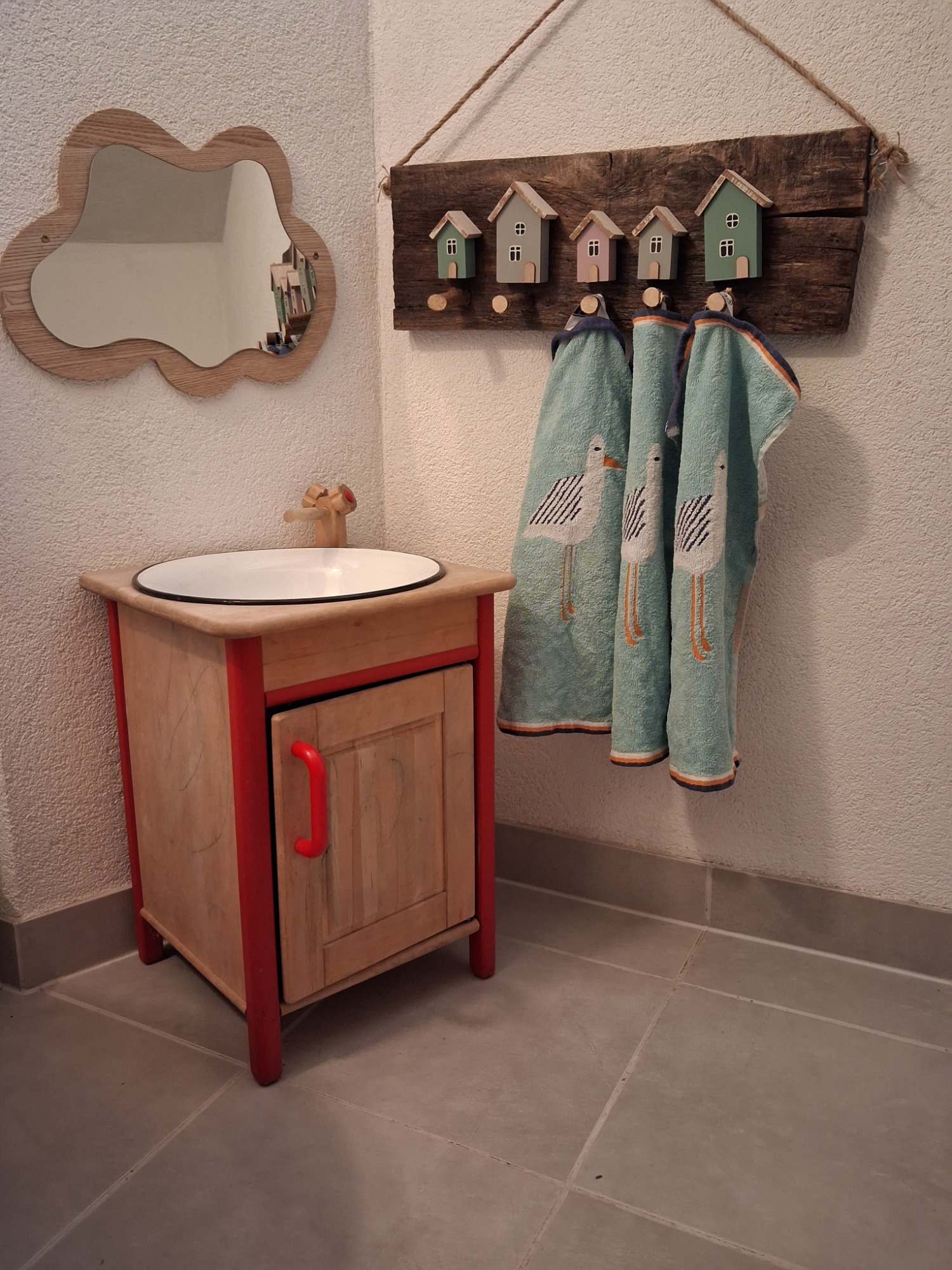 Für die Dorfknirpse steht ein separater Eingang zur Verfügung. Nach dem Prinzip der Montessori Pädagogik, können die Kinder sich an einer Garderobe und einer Sitzbank, die auf die Größe der Kinder ausgelegt ist, umziehen. Ein eigenes Ablagefach für ihr Kind ist selbstverständlich.