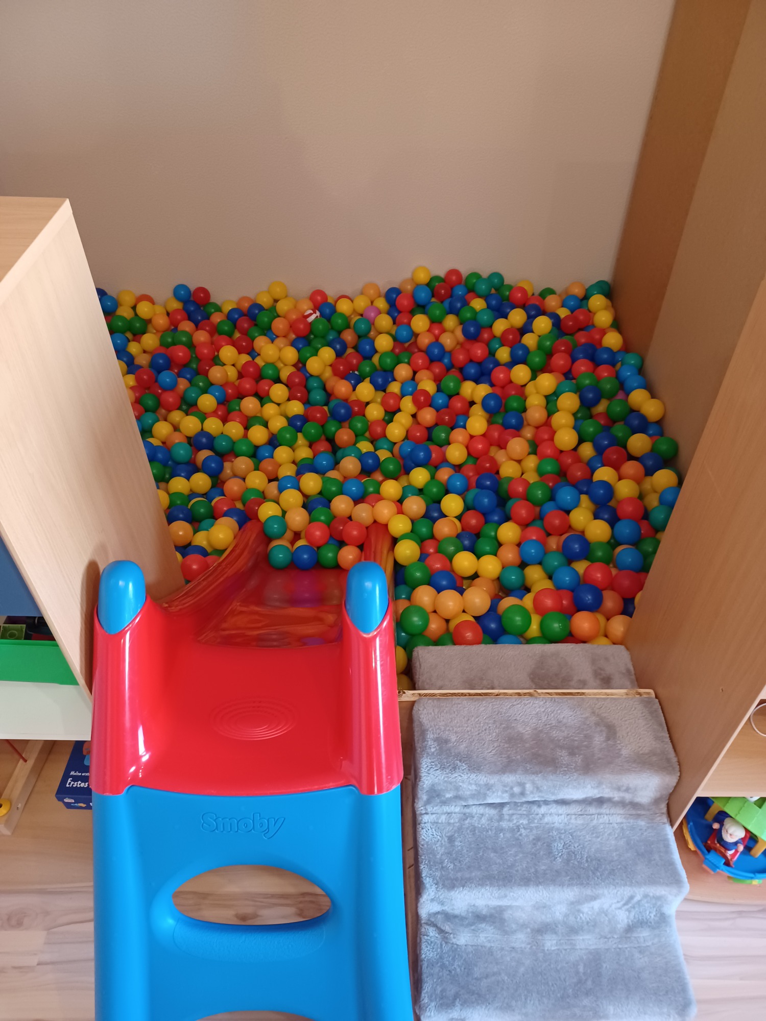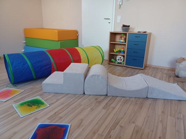 Die Regale im Spielzimmer sind offen gestaltet. Alle Spielsachen und Bücher sind auf Kinderhöhe und frei zugänglich. Damit keine Langeweile aufkommt, werden die Spielsachen regelmäßig ausgetauscht und dem individuellen Alter und Interessen der Kinder angepasst. Außerdem ist der helle Raum mit einem großen Bällebad ausgestattet, welches zum Toben einlädt. Wer es lieber rasant mag, nutzt die umkippsicheren Rutschfahrzeuge.
