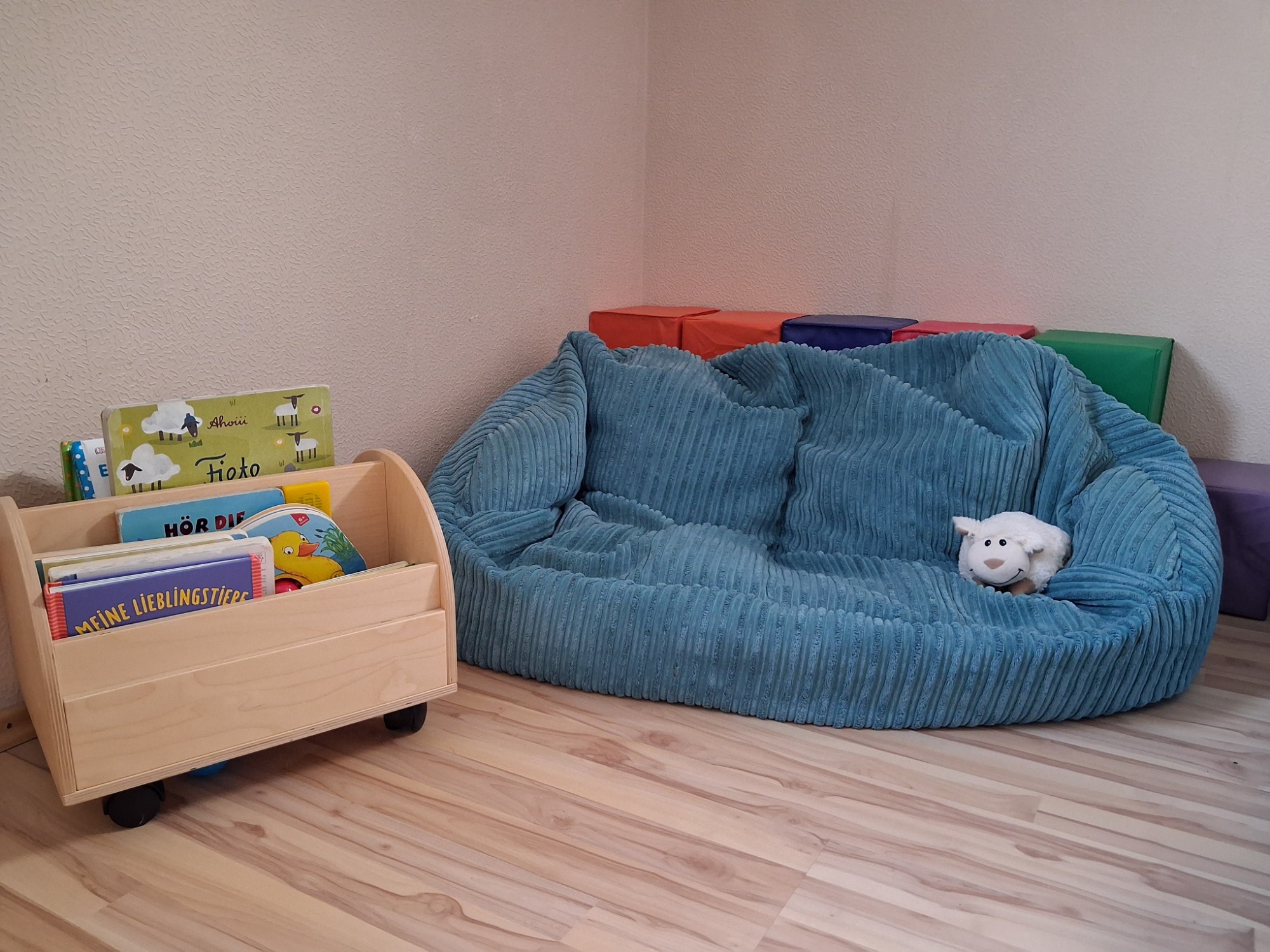 Eine Kuschelecke mit weichen Kissen und Kuscheltieren bietet nach ausgiebigem spielen Ruhe und Erholung. Ausgewählte Bücher stehen ebenfalls zur Verfügung und werden gerne von mir vorgelesen und dem Alter der Kinder angepasst. Leichte Schaumstoffbetten werden zum hygienischen und sicheren Schlafen und Ruhen ausgelegt.