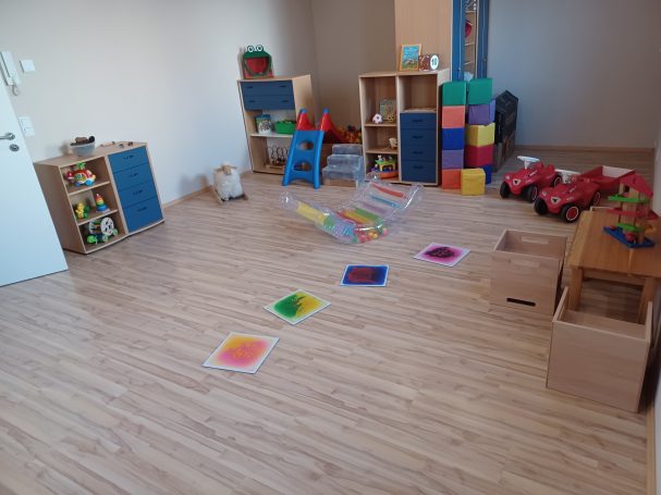 Über den Flur kommen wir in unseren 30 qm großen Spielraum, welcher zum Toben, Basteln und dem Vorlesen von Geschichten vorgesehen ist. Der Raum verfügt über eine Fußbodenheizung und genügend Fenster, die für eine helle und angenehme Atmosphäre sorgen. Diesen nutzen wir beim Ankommen der Kinder oder auch bei schlechtem Wetter (starker Wind oder Regen).